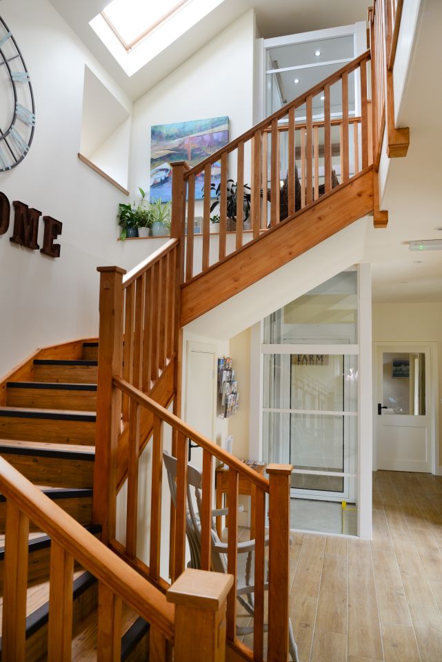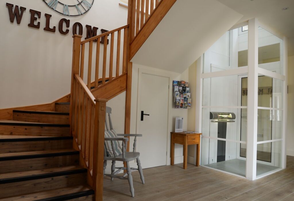 With its predominantly clear-glazed construction, the platform lift complements Fenham Farm B&B’s coastal aesthetic, moving less ambulant guests between facilities ranged over two floors.