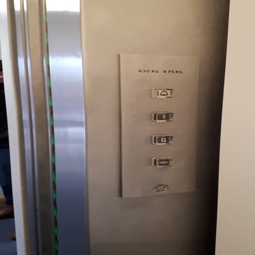 A digital lift car position and direction of travel indicators were fitted within the car operating panel, as well as an audible speech annunciator to indicate the current level and movement of doors – a big improvement from the old lift’s control panel, which offered none of these features. An emergency ring-pull alarm was also installed in case a passenger had fallen down and required emergency assistance.