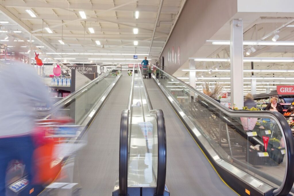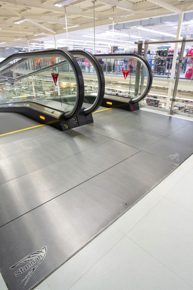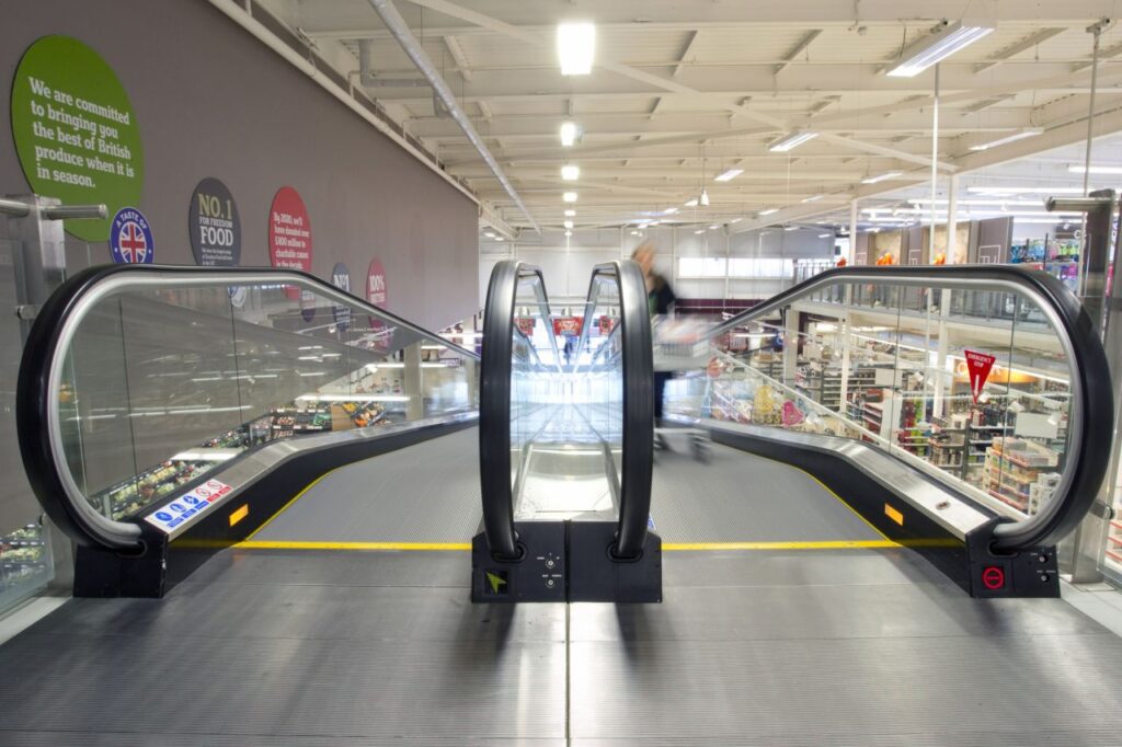 Operating between the ground-floor entrance area and food hall and first-floor TU clothing department, café, cloakrooms and baby-changing facilities, two ST inclined moving walkways deliver secure, efficient movement for shoppers and their trolleys. Supported by clear glass panel balustrades, the extra slim handrails feature strategically-sited, tactile white markers to assist the partially sighted. Safe travel for all is furthered assured by an automatic announcement system that broadcasts guidance and alert messages.