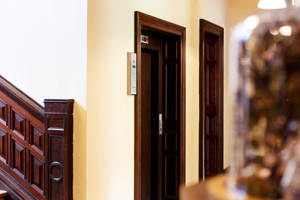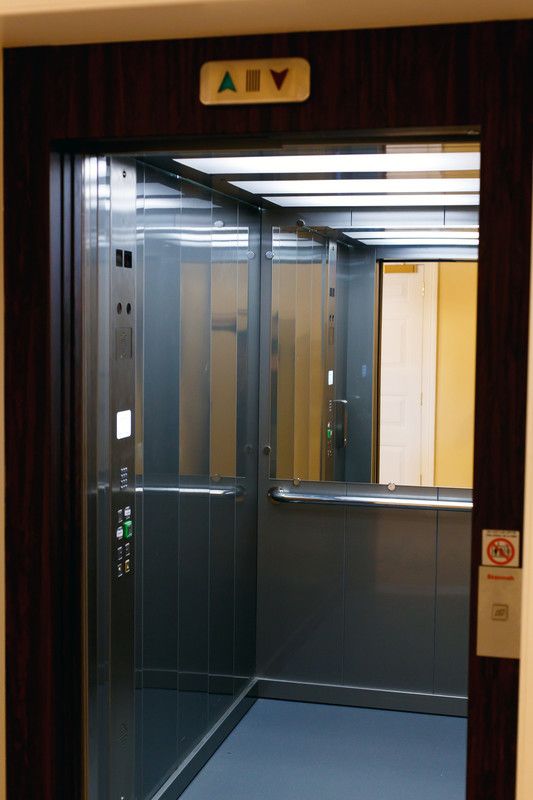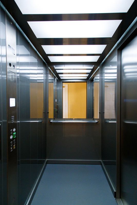 To complement the abundance of dark wood in this Victorian building, the exterior lift doors and architraves are finished in durable mahogany wood-effect vinyl skin plate. These doors open silently to reveal a contrasting modern interior, finished in satin stainless steel, with a half-height rear mirror, downlit ceiling, grab rails, non-slip floor and evacuation intercom.
