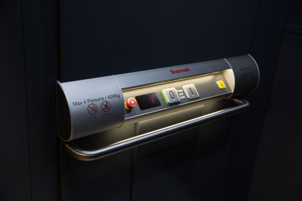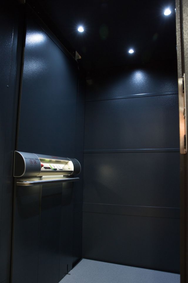 The RAL 7016, anthracite-grey finish echoes the industrial décor and is tough enough to withstand daily use. Panoramic glazed doors at both levels make the lift light and airy, and the downlighter ceiling provides essential lighting, switching off to minimise running costs when not required. The streamlined operation panel, with grab rail, is simple to use, and the intercom and non-slip light grey floor offer further reassurance.