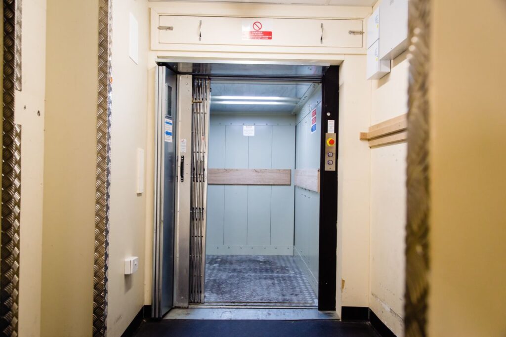 Responsible for the movement of stock-filled roll cages between two floors, the single-entry goods lift car interior is finished in grey baked enamel epoxy finish, complete with bump rails and chequer plate steel floor, with loads safely secured in transit by a (stainless) galvanised-steel picket gate.