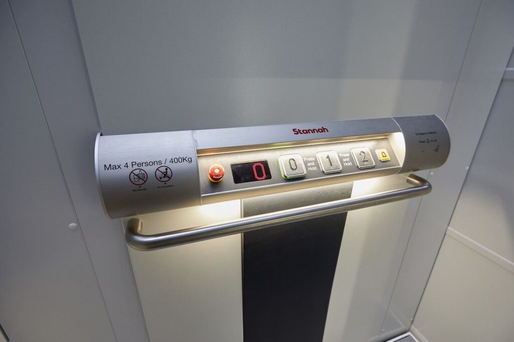 The lift interior features a ceiling with light and timer, simple push-button operation, grab rail and intercom. Call buttons are located on the approach wall, and the neutral aesthetic is complemented by a glass viewing panel in the main door.