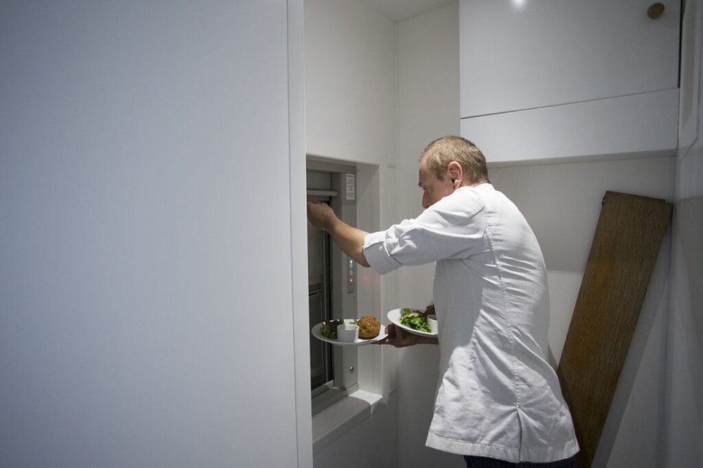 Housed within an 830mm x 800mm shaft, the dumbwaiter car is constructed in mild steel and finished in grey baked-enamel (RAL 7038), with a stainless steel base and a removable stainless steel shelf to enable easy cleaning. An intercom supports the lift’s operational efficiency.