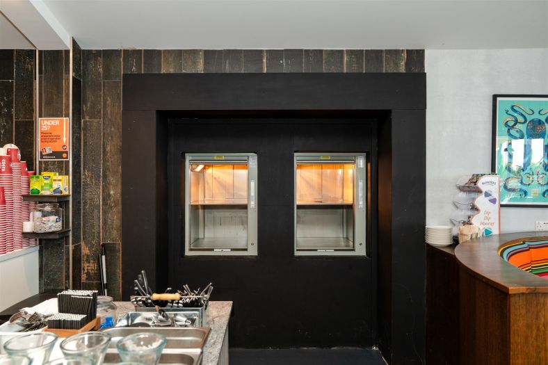 It’s a type of service lift, also known as a lazy waiter, food lift or restaurant dumbwaiter, often used to carry and transport food and drinks in hospitality venues such as bars, restaurants and domestic kitchens.